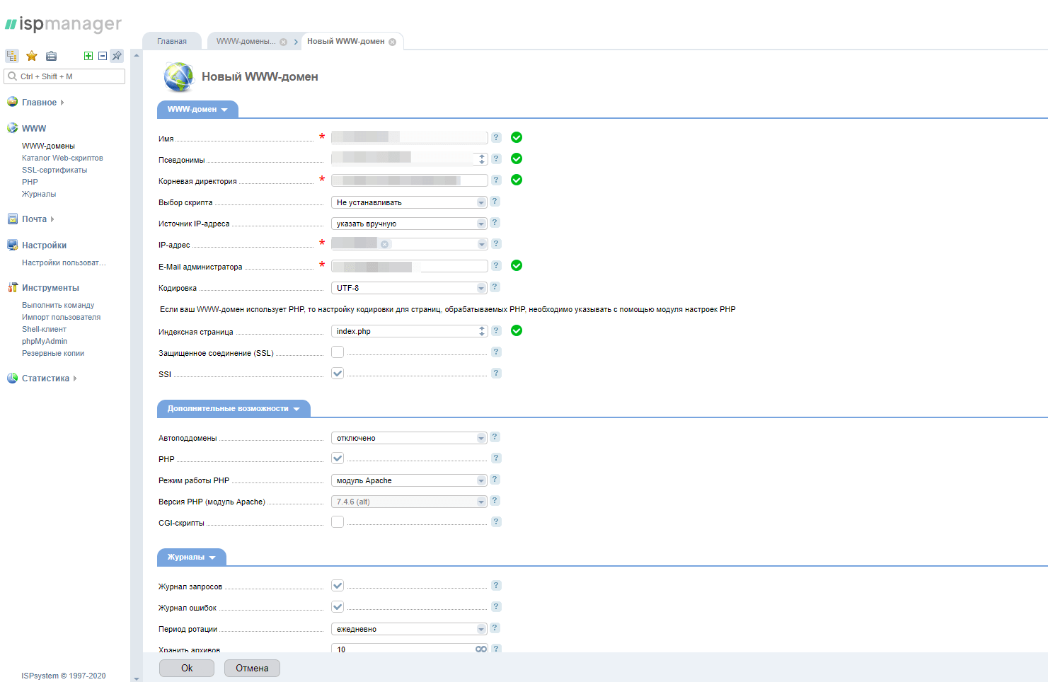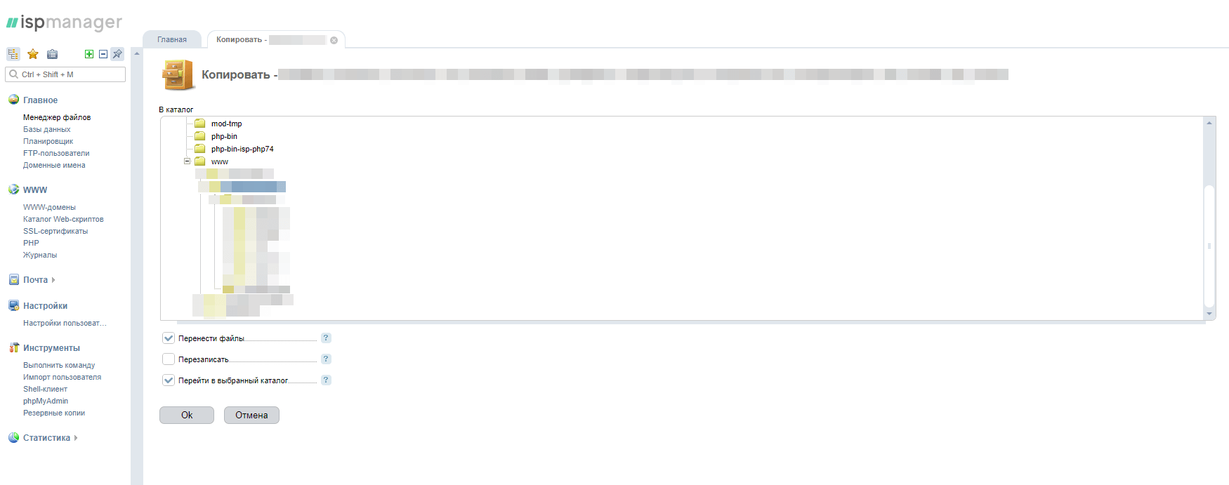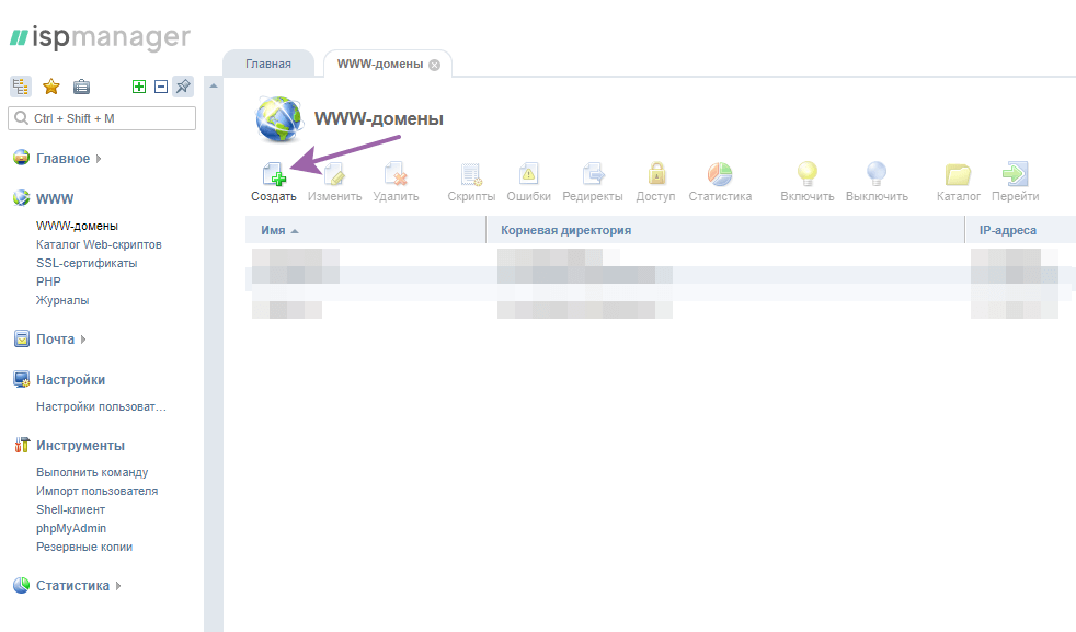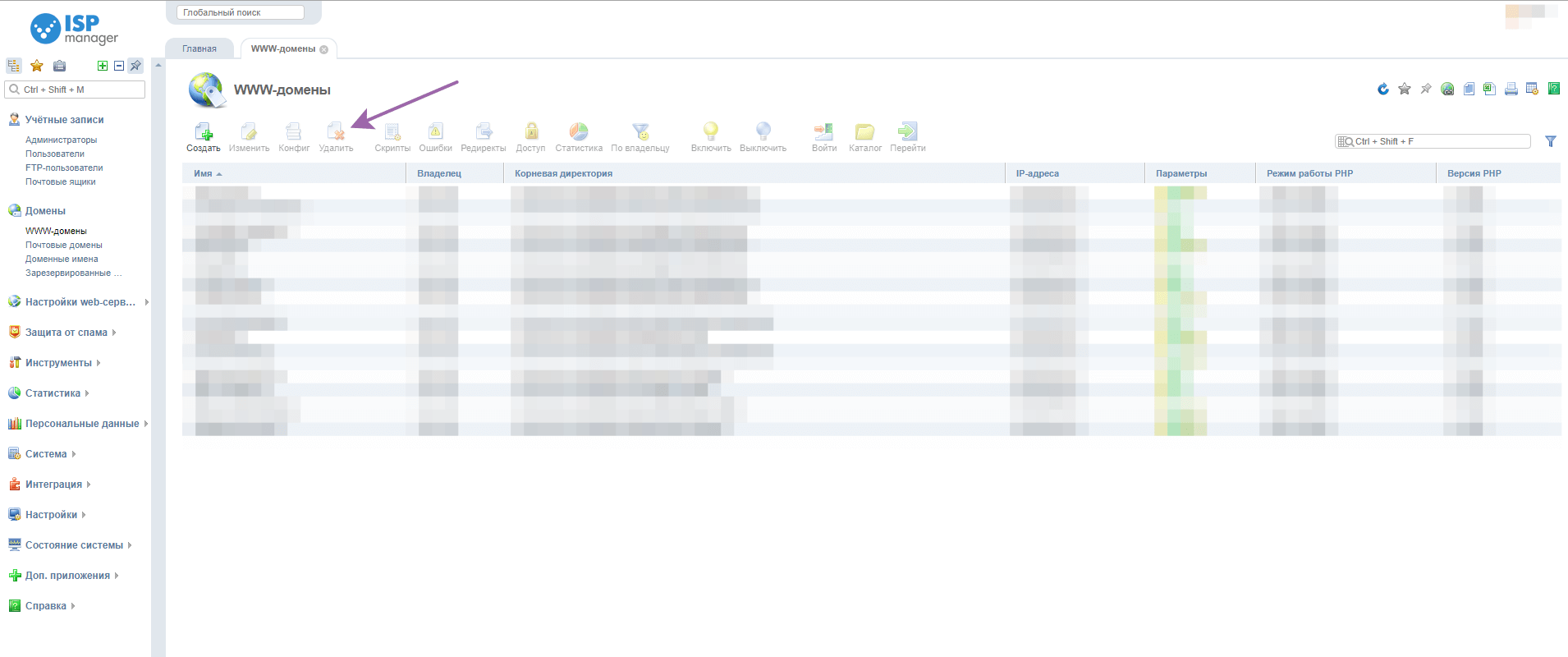 Возвращаемся в ISPmanager под пользователем root (на старом сервере). В разделе www-домены удаляем те домены, которые перенесли на новый сервер: