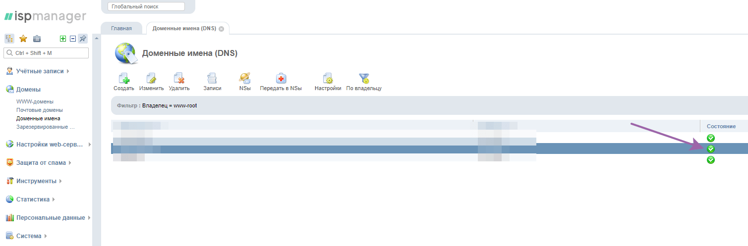 После завершения процесса статус домена должен отображаться зеленой галочкой.