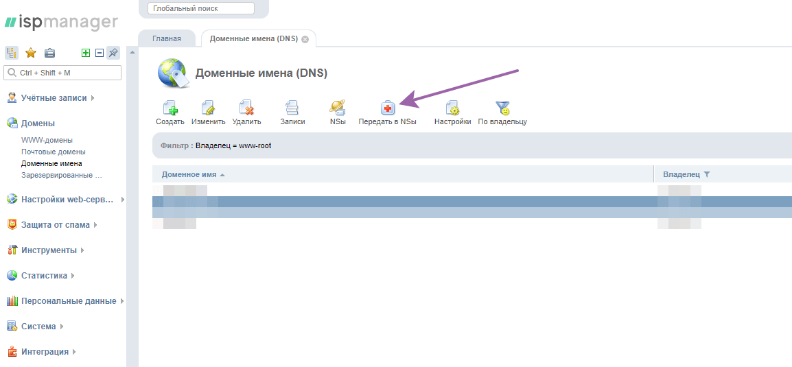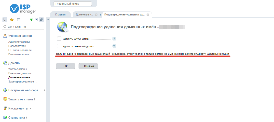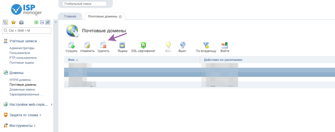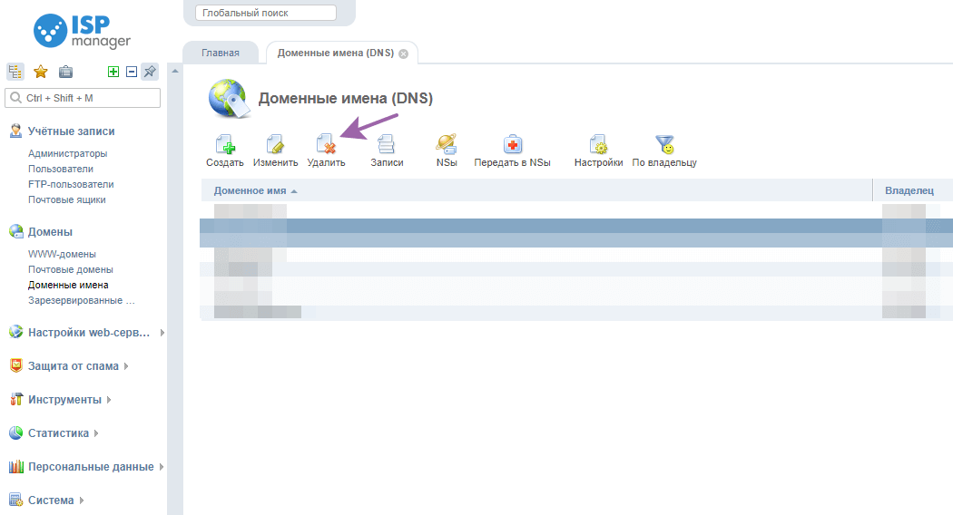 Заходим в ISPmanager под пользователем root (на старом сервере). В разделе Домены -> Доменные имена удаляем запись о домене который перенесли.