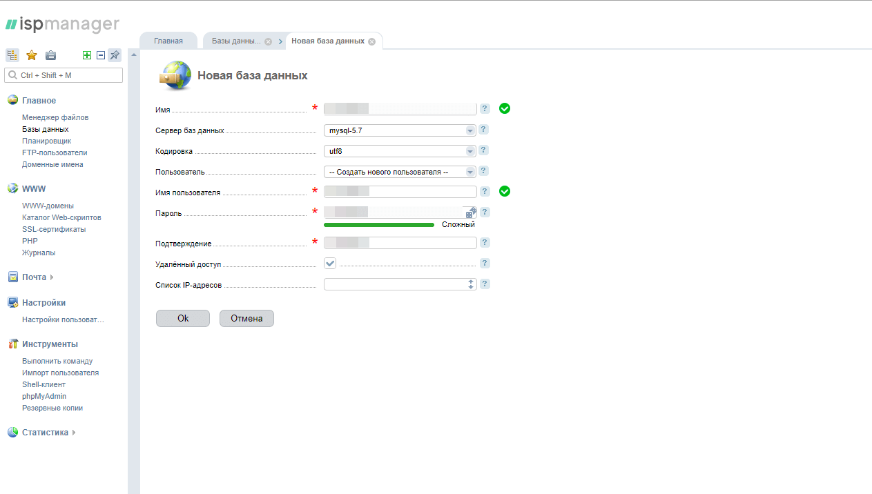 Заполняем необходимые поля. У меня подключение к базе данных осуществляется через удалённый доступ.