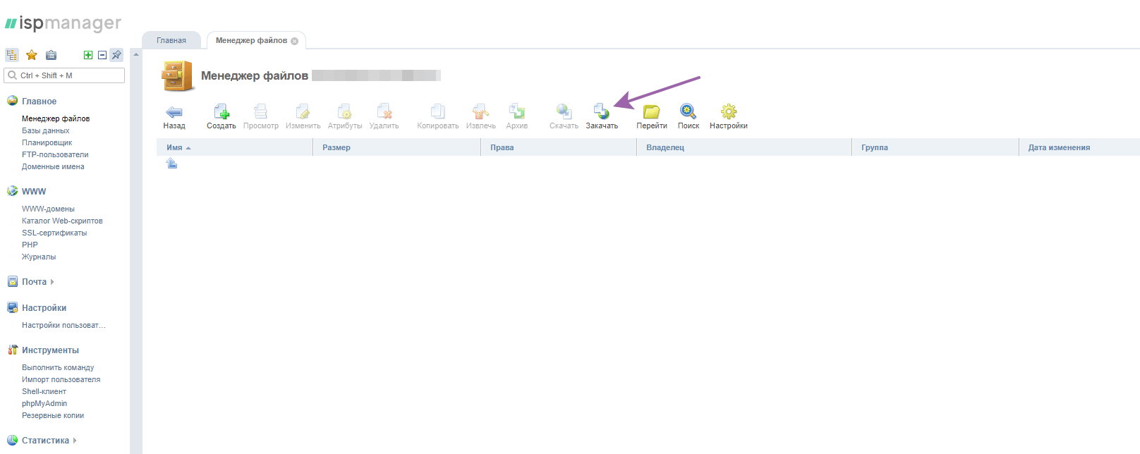 Затем переходим в файловый менеджер, заходим в директорию только что созданного проекта и удаляем всё содержимое этой директории (при создании www-домена директории сами создаются).